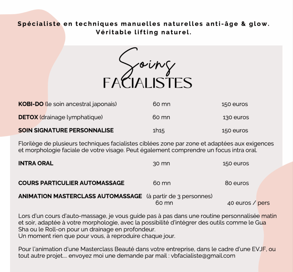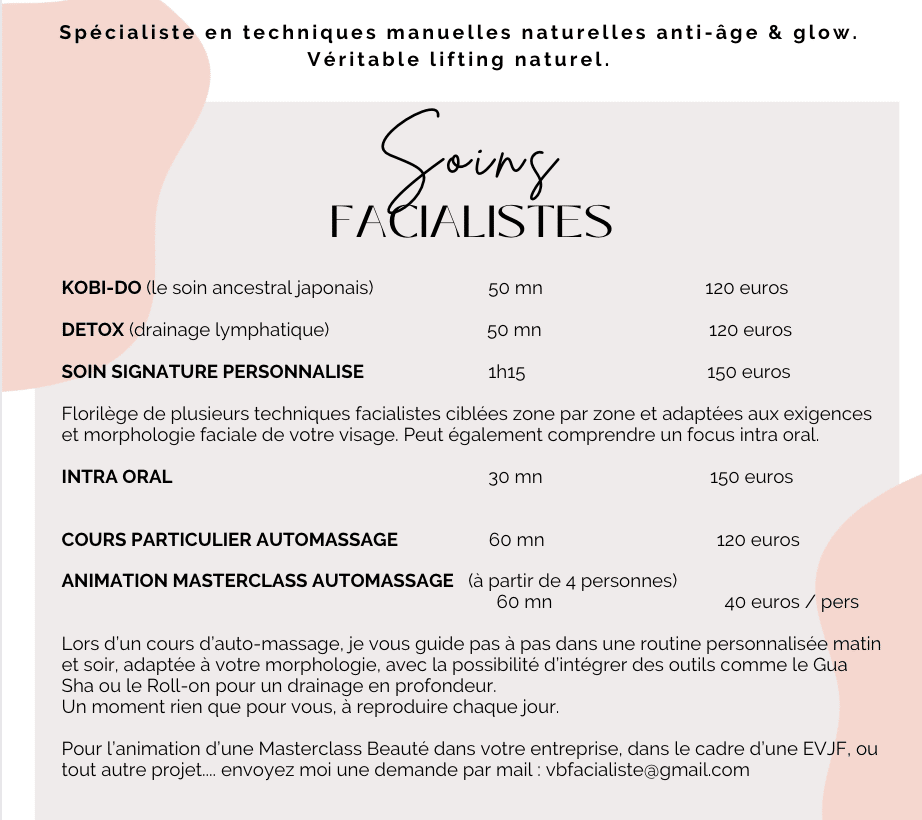 Chaque rendez-vous commence par une observation attentive de votre visage, suivie d’un échange sur vos habitudes de soin et l’état actuel de votre peau. Cette étape cruciale me permet de personnaliser chaque soin en fonction de vos besoins du moment. Vous aurez alors l’opportunité de choisir entre un soin personnalisé adapté à votre peau ou d’opter pour l’un de nos soins signature de l’Académie des Facialistes (méthode LB Facialistes), tels que : KOBI-DO – DETOX – INTRA ORAL.